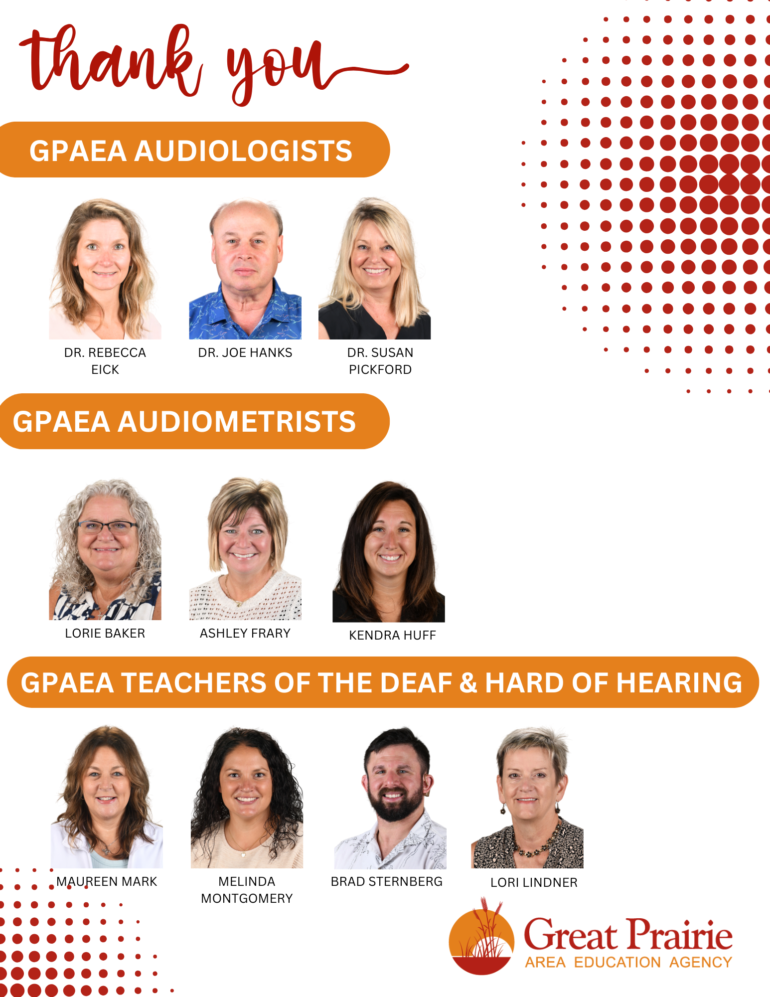 Join us in celebrating Deaf Awareness Month! This month allows us to highlight the importance of providing equal access for children who are Deaf, hard of hearing, or experiencing hearing loss. Raising awareness through month-long observations and learning opportunities is an important part of creating understanding and increasing access for our kids. Thank you to our Audiologists, Audiometrists, Teachers of the Deaf & Hard of Hearing, and assistants at Great Prairie AEA!